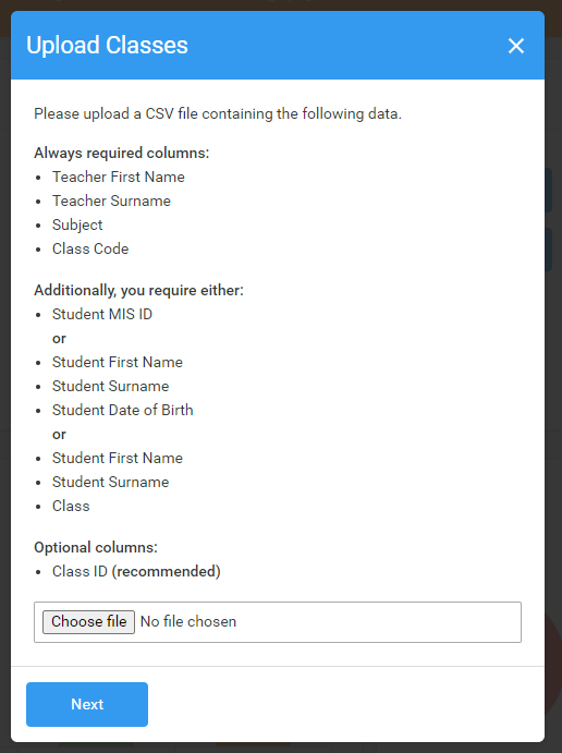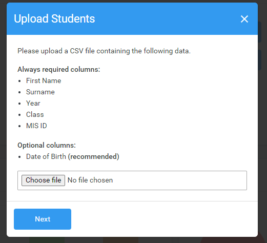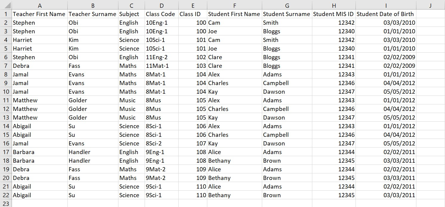 - Student MIS ID, student number, or date of birth - as previous, the system will use these fields alongside the students' names to assign them to the class, and all data fields must match exactly