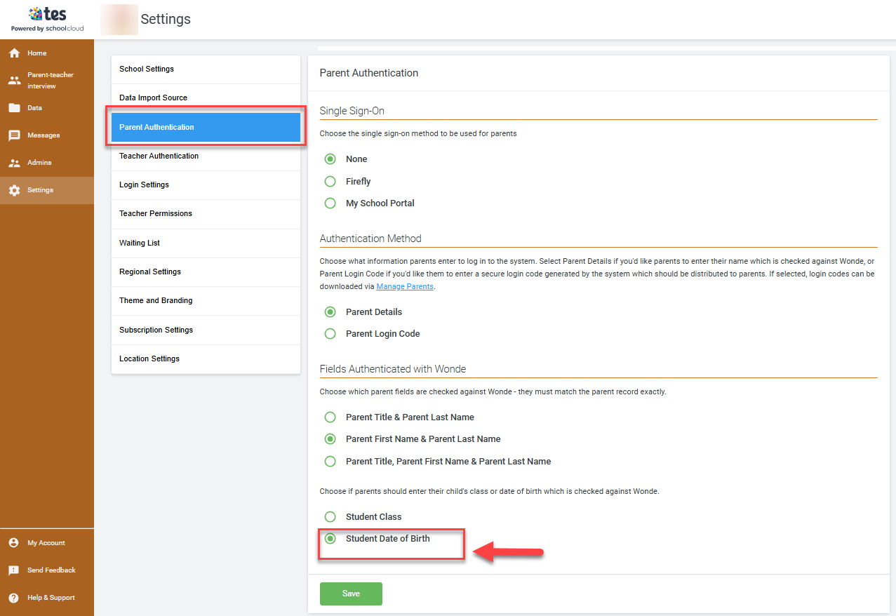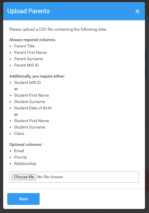 - Student MIS ID, student number or date of birth - the system will use the students' names and either their MIS ID, student number, or date of birth to create a relationship between the parent and student records in the system, and all data fields must match exactly