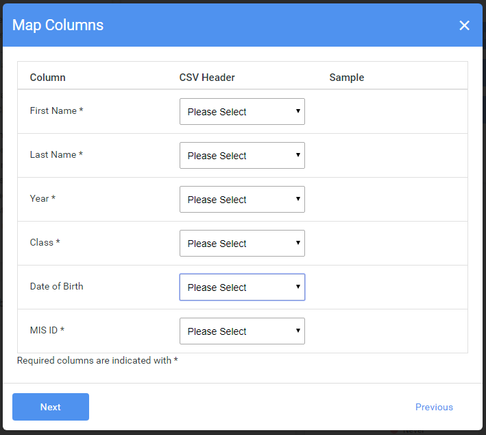 Once you upload the files, the system will attempt to match the expected column to a column in the csv file you are uploading, please check that this is correct before clicking Next. If you title the columns in your import files to the expected column names, the mapping should line itself up by default.