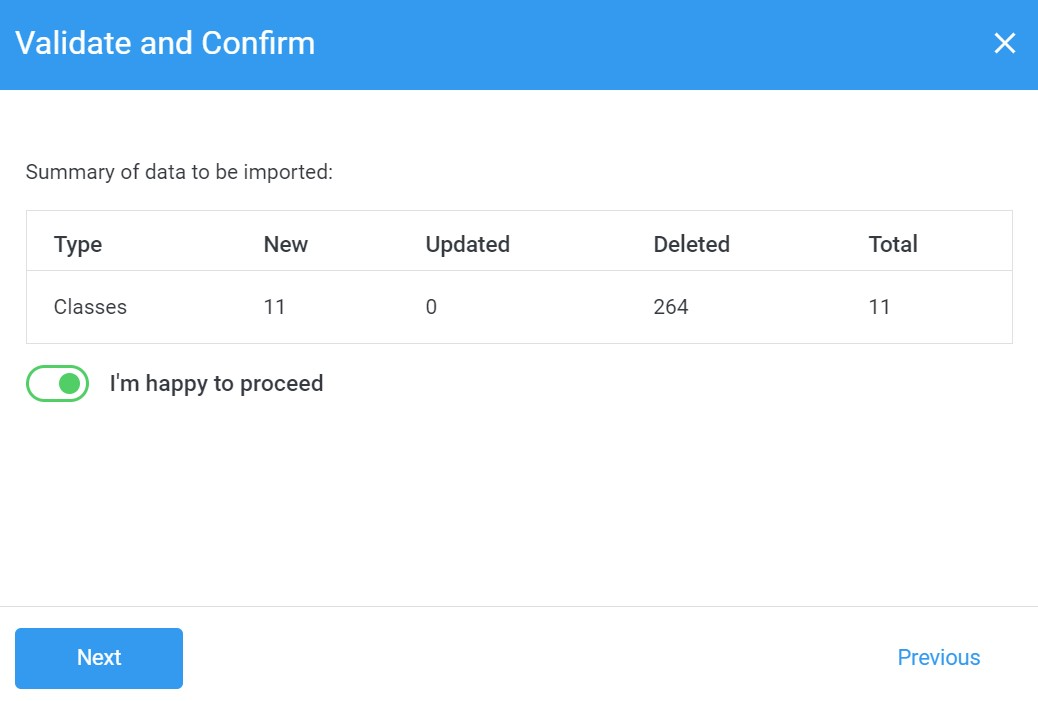 Start the upload by clicking the I'm happy to proceed button and click Next. The data is then uploaded and confirmed.