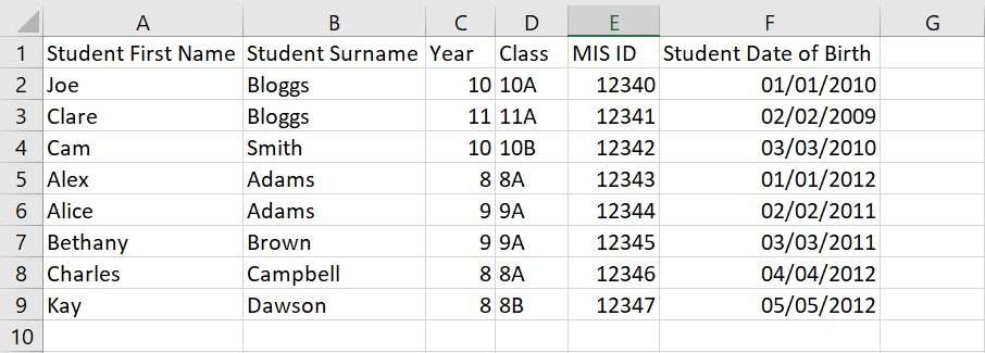 - Student MIS/SIS ID - this is a unique numerical identifier from your MIS. If your management system does not supply one, you can add a unique number per student