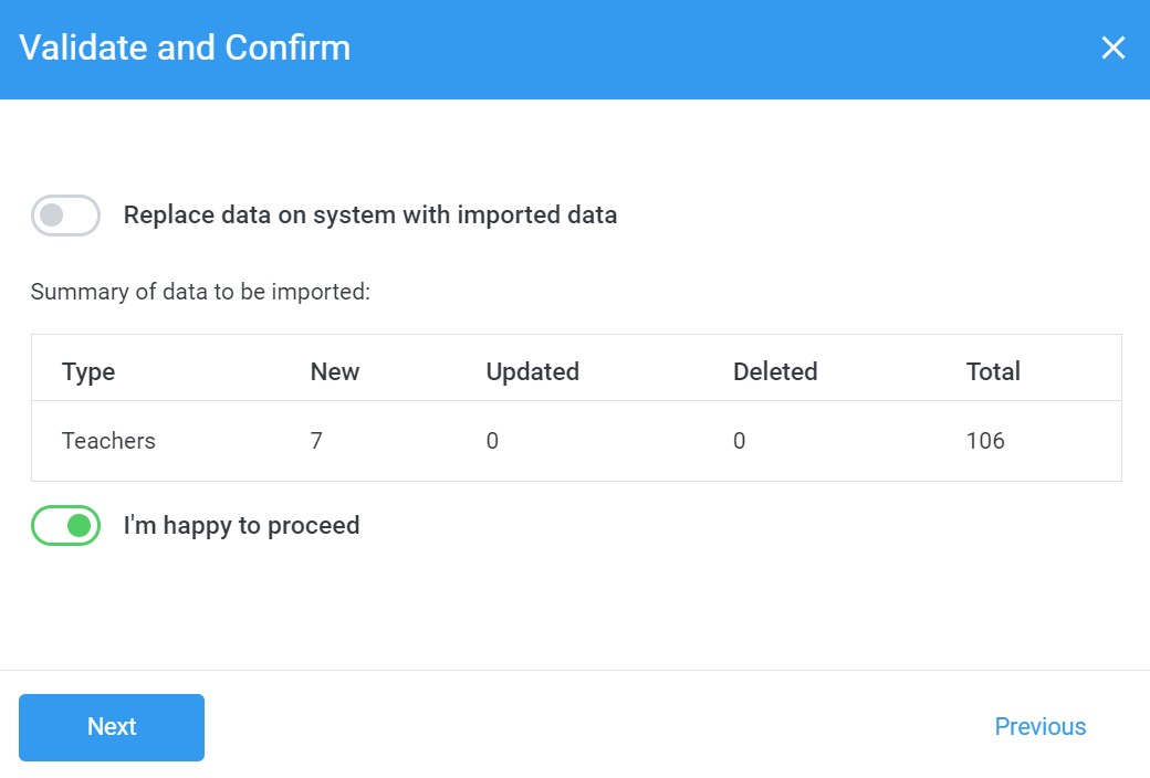 If you are adding or editing just a few teachers, students or parents then do not select Replace data on system with imported data as this will replace all your existing teachers, students or parents with the contents of the file.