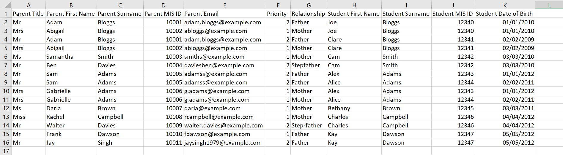 PLEASE NOTE: if you're importing a parent for a new student but the parent already exists on the system (e.g. a sibling of an existing student joining the school), you will need to include lines in your parent import for all children associated with the parent, not just the new student